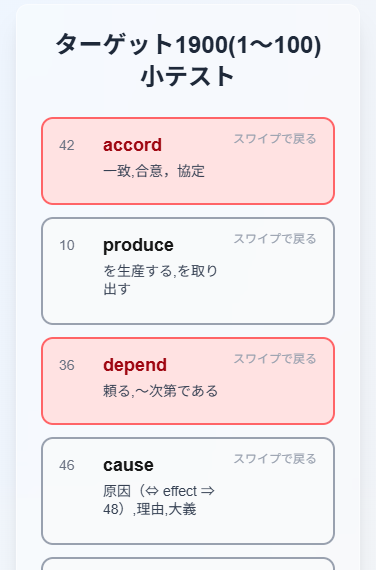 見てすぐに意味が分からない単語はタップしてカードを赤くします。