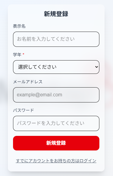 お名前(ニックネーム)、学年(大学生、社会人)、メールアドレス、パスワードを設定し登録ボタンを押します。